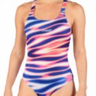 TRAJE DE BAÑO ENTERIZO ANTICLORO DAMA CON ESTAMPADO IRREGULAR Y ESPALDA CON BRETEL CRUZADO