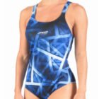 TRAJE DE BAÑO ENTERIZO ANTICLORO DAMA CON ESTAMPADO IRREGULAR Y ESPALDA CON BRETEL CRUZADO