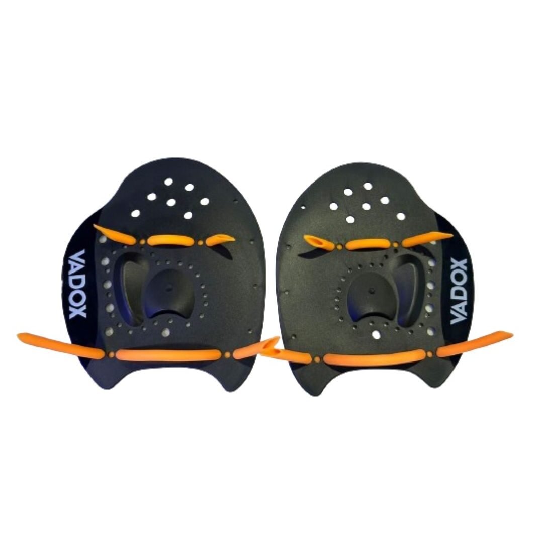 MANOPLAS VADOX PARA NATACIÓN planas con orificios para entrada/salida de agua y correas ajustables tubulares. Ayuda a incrementar la fuerza del tren superior y mejorar la técnica. Reduce la tensión en hombros. Livianas, suaves, duraderas. Fabricadas en polipropileno, correas de goma.